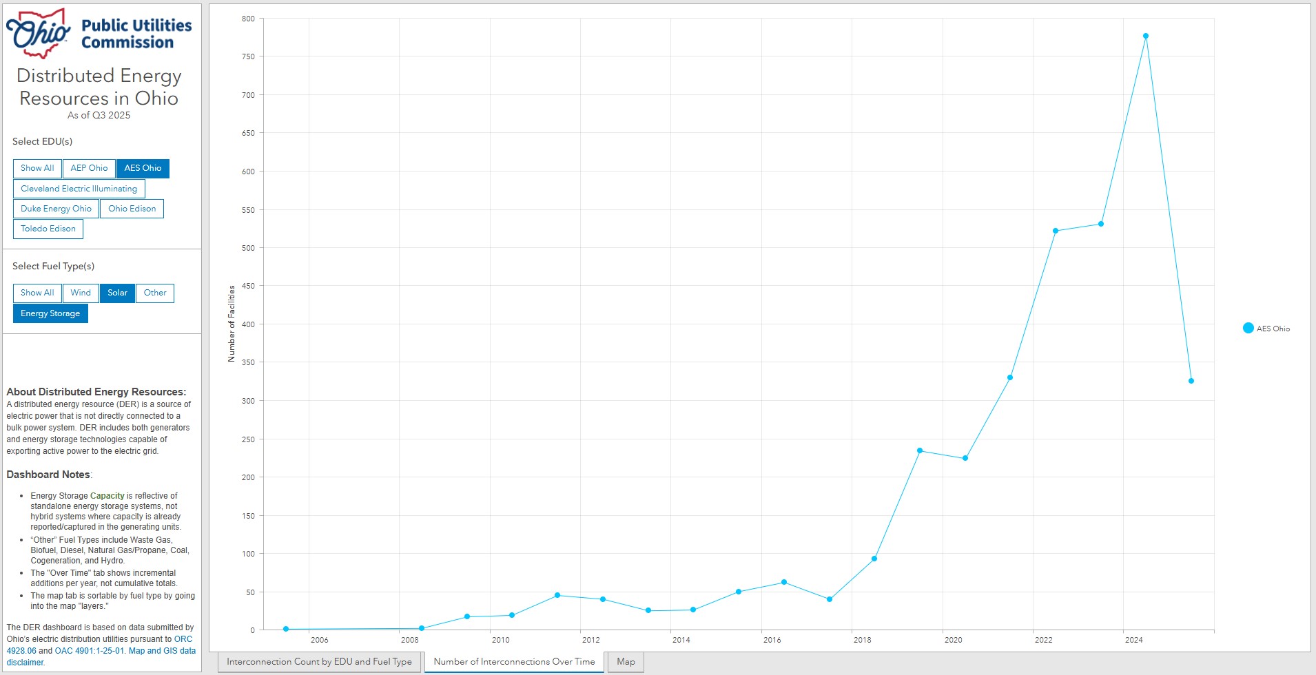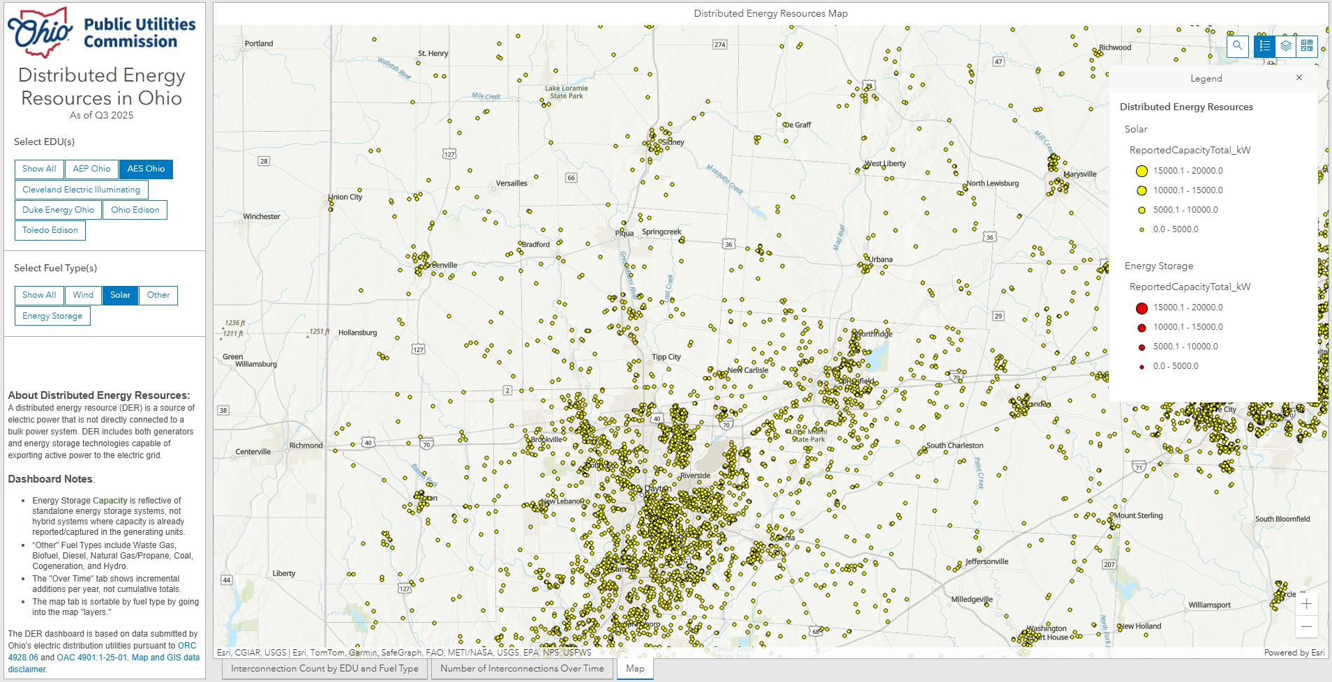 The Public Utilities Commission of Ohio maintains an online dashboard of Distributed Energy Resources in Ohio, based on over 33,180 interconnections (as of the third quarter of 2025). This online tool allows you to filter by utility, and by renewable source. It also includes “energy storage” as a category. For the Miami Valley’s largest electric utility, AES-Ohio, the dashboard reports 3,363 solar and/or storage interconnections with a total capacity of 36,315 kW.